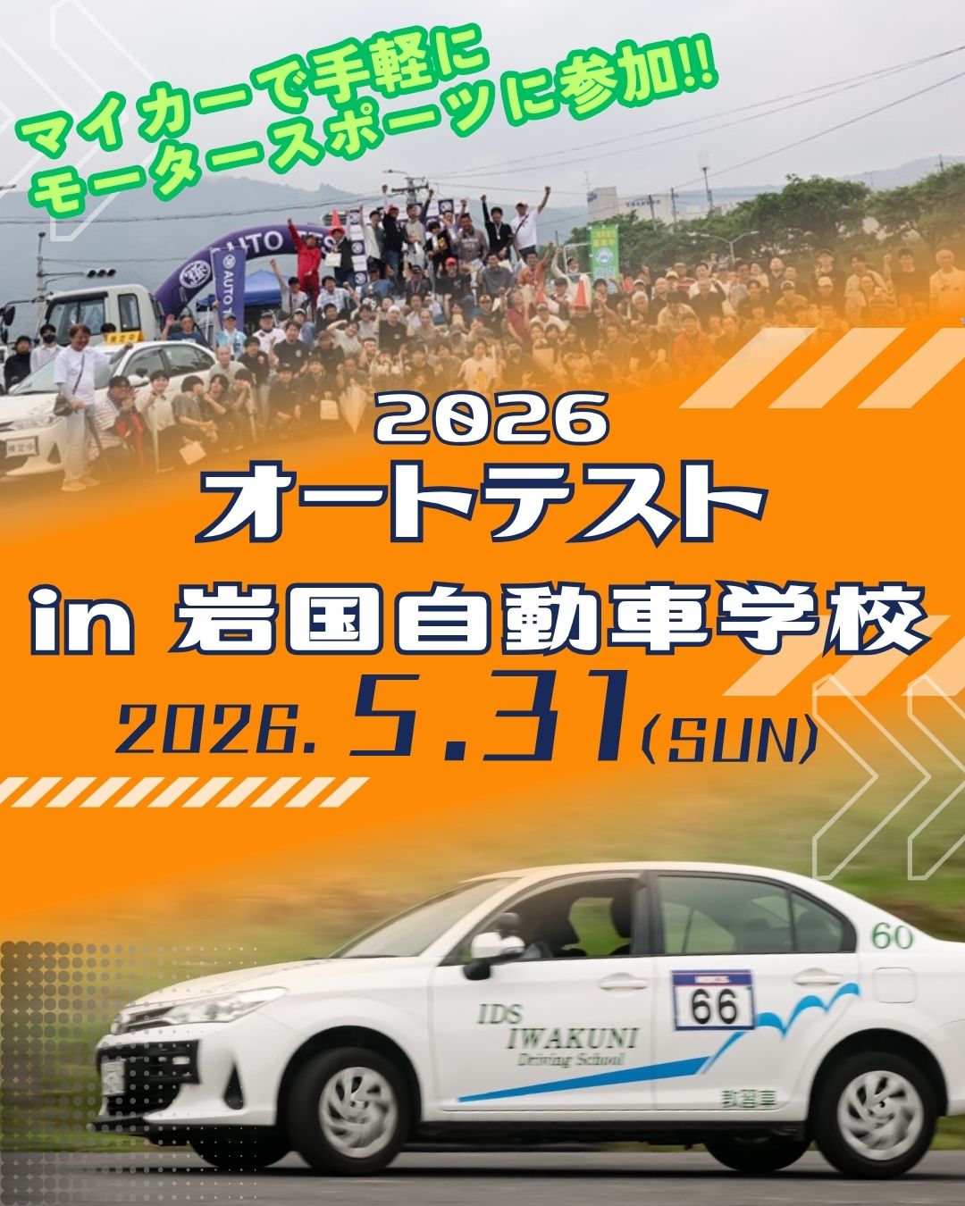 去年大盛況のうちに幕を閉じたオートテストですが 今年も開催することが決まりました!! モータースポーツに興味のある方なら初めての方にもおススメの大会です 参加されない方でも今年は様々なイベントを開催予定なのでぜひご観戦ください 定員は80人ですが去年と同様すぐに満員になると予想されるので 早めの応募をお願いいたします!! 詳しくはこちらから ↓ イベント概要・参加申し込み